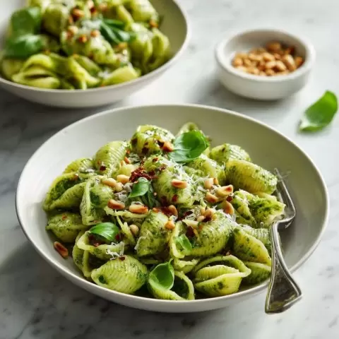 Смешайте песто с отваренной пастой, подкорректируйте приправы, добавьте каперсы. Подавайте с посыпкой из панировочных сухарей для хрустящей текстуры. Приятного аппетита!