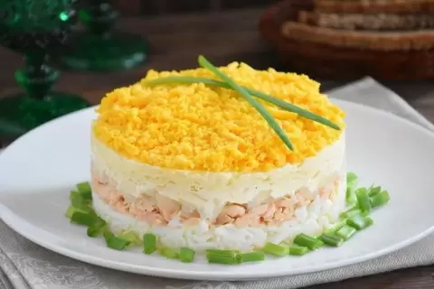 - Классическая «Мимоза»: Используйте натуральную консервированную горбушу, варёные картофель и морковь, яйца, репчатый лук и майонез. Каждый слой салата соберите в определённой последовательности — это главный секрет успеха.