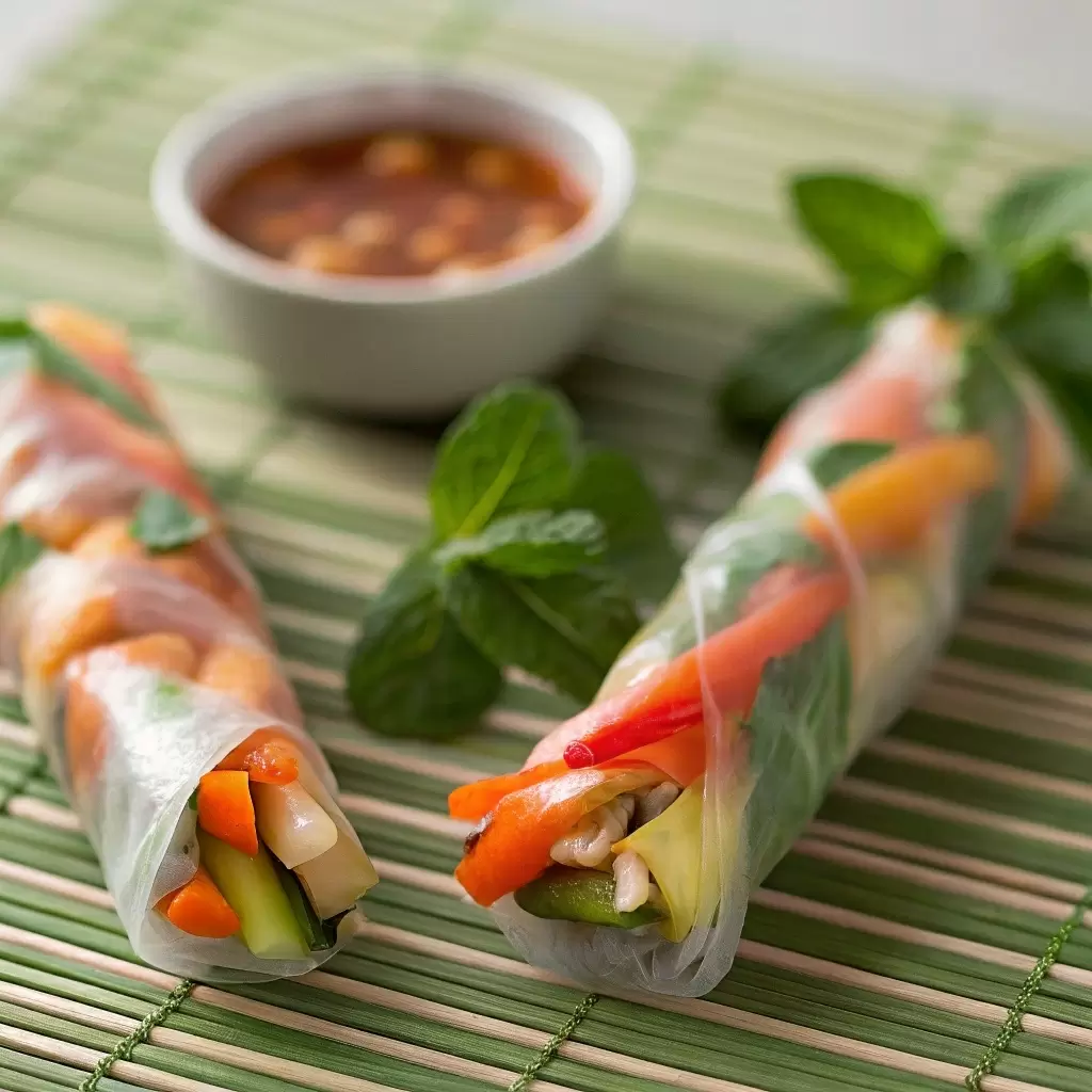 - Спринг-роллы с овощами и кешью: легкие и свежие, они идеально подходят для перекуса. Заполните рисовую бумагу морковью, огурцом и кешью, и подайте с соусом чили.