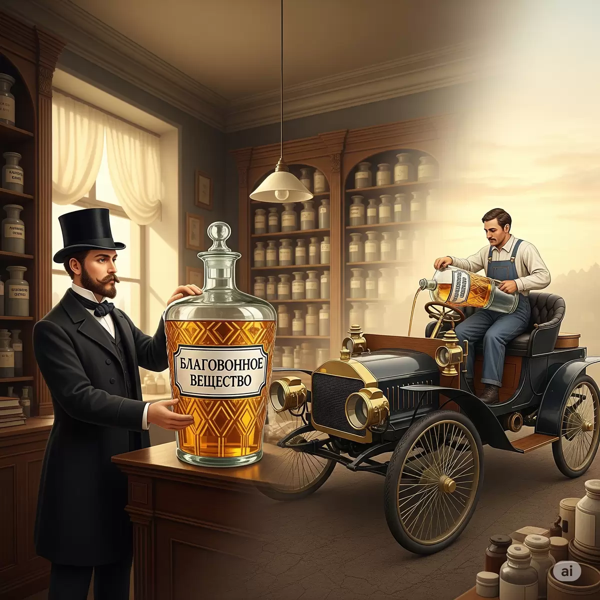 До всех удивлений, покупатель на самом деле не планировал использовать жидкость для чистки. На улице его дожидался шикарный четырехколесный транспорт с блестящей металлической окраской, отличавшийся от электрокарет. Подручными средствами водитель заливал жидкость в специальный бачок своего автомобиля, при этом утверждая, что его аптечный бензин — лучший в городе. Так, это благовонное вещество, когда-то предназначенное для полоскания горла и ухода за нарядами, стало топливом для первых автомобилей, открыв новую эру в истории транспорта.