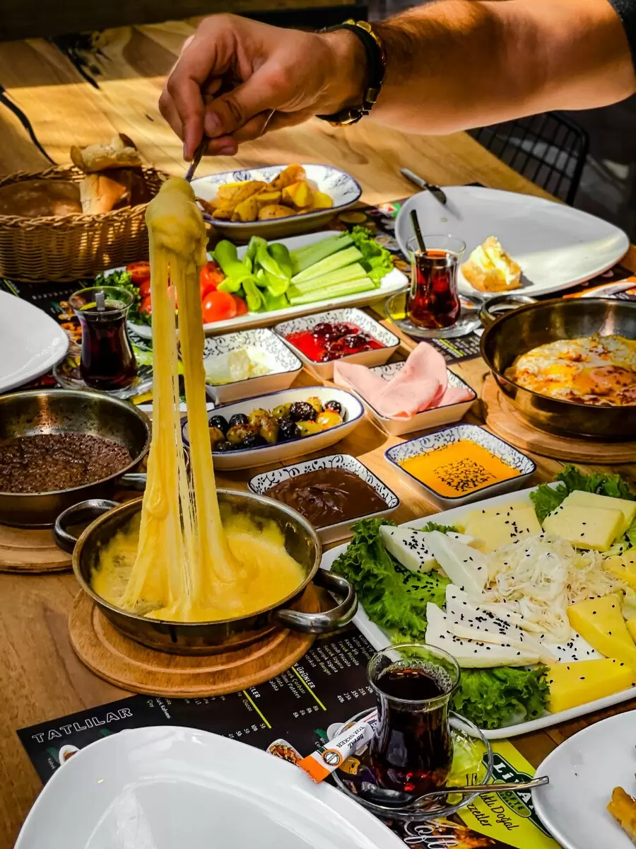 Характерная черта турецкого завтрака — это обилие угощений. Каждый стол выглядит как произведение искусства, наполненное множеством разных блюд: