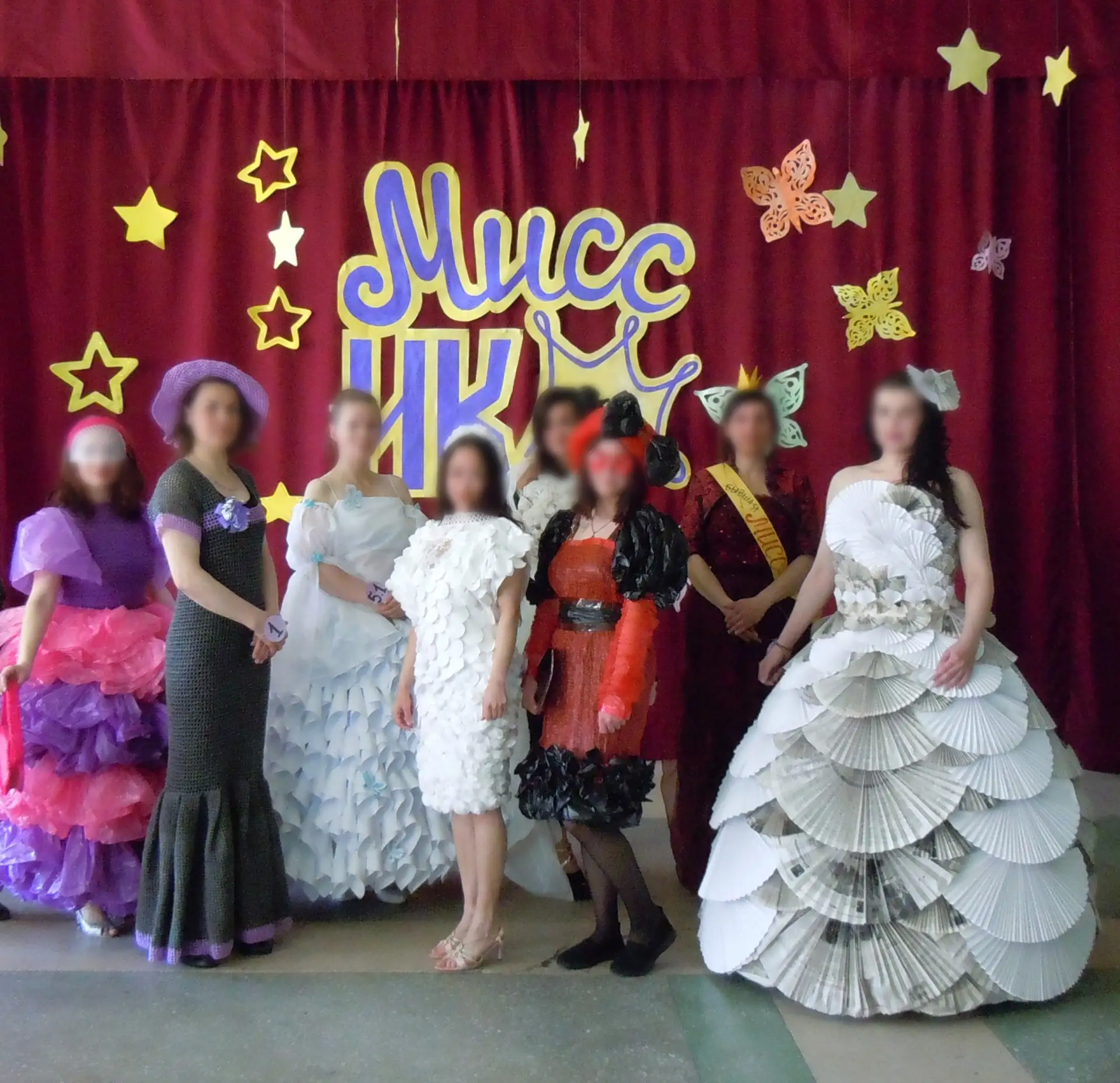 Первый этап — дефиле в вечерних нарядах, сделанных из подручных материалов. В ход пошли бумага, старые газеты и целлофановые пакеты. Жюри оценивало не только платье, но и причёску с макияжем. Второй этап — творческий: женщины танцевали, пели и читали стихи.