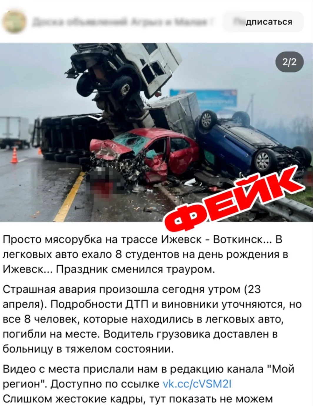 Фейк о страшном ДТП на трассе Ижевск – Воткинск распространяют в соцсетях.