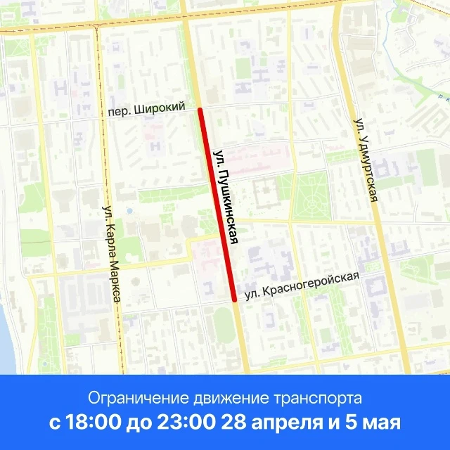 28 апреля и 5 мая с 18:00 до 23:00 – ул. Пушкинская от ул. Красногеройская до пер. Широкий