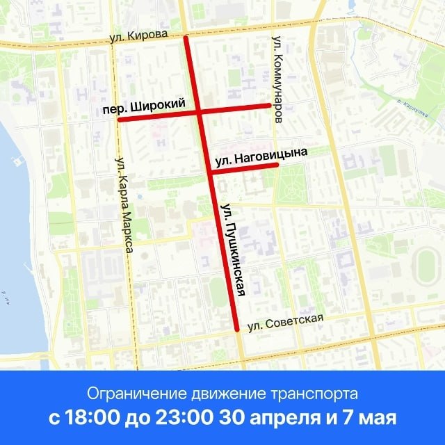 Проехать нельзя будет 28 апреля и 5 мая с 18:00 до 23:00 по ул. Пушкинской от ул. Красногеройской до пер. Широкого.