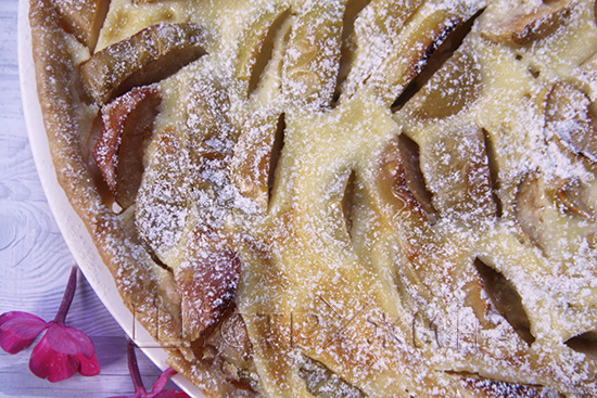 Открытый пирог с яблоками на хрустящем тесте, дополненный нежной сметанно-яичной заливкой и кусочками запечённых яблок — этот киш непременно удивит ваших гостей.
