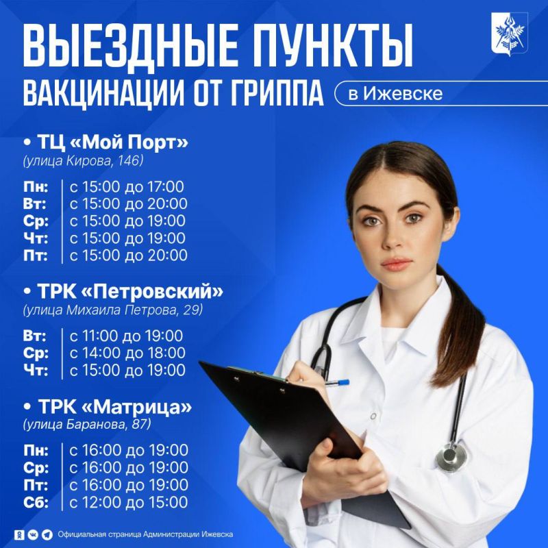 Полное расписание – в карточке.Доступно три вида вакцин: «Совигрипп» - для взрослых и детей; «УльтриксКвадри» - специально для малышей и будущих мам; «Флю-М».Поставить прививку от гриппа можно также в поликлинике...