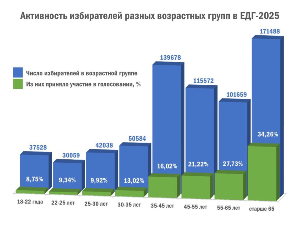 В ЕДГ-2025 самыми активными оставались избиратели старшего возраста, например, в возрасте 65+ проголосовали 34,26% от общего числаСтуденты пока в «отстающих» - 8,75% от числа избирателей в возрасте от 18-22 лет.Наибольшее число молодых людей...
